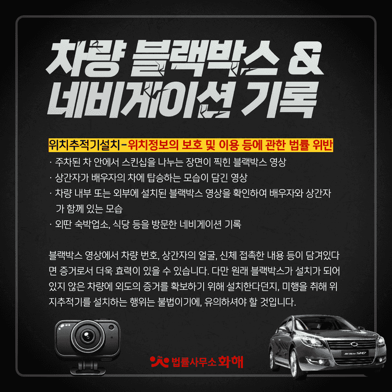 블랙박스 영상에서 차량 번호, 상간자의 얼굴, 신체 접촉한 내용 등이 담겨있다면 증거로서 더욱 효력이 있을 수 있습니다. 또한 출장 간 배우자가 외딴 숙박업소, 식당 등을 방문한 네비게이션 기록도 불륜의 증거가 될 수 있는데요. 다만 원래 블랙박스가 설치가 되어 있지 않은 차량에 외도의 증거를 확보하기 위해 설치한다던지, 미행을 위해 위지추적기를 설치하는 행위는 불법이기에, 유의하셔야 할 것입니다.