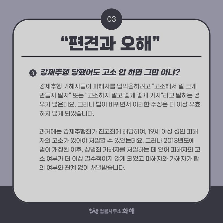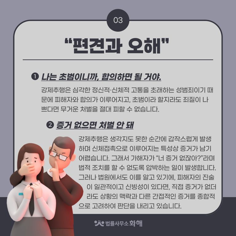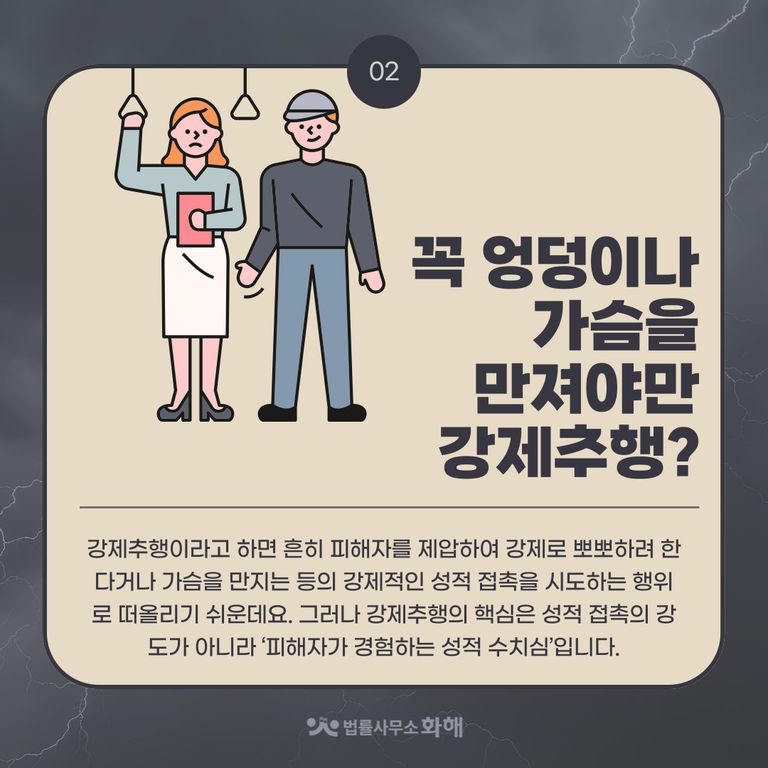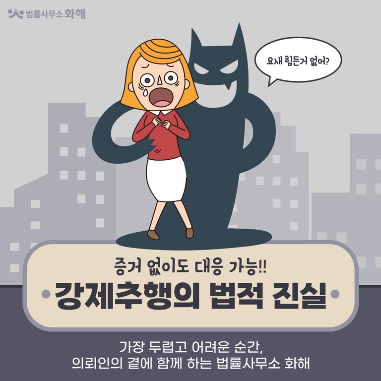 이런 일이 발생했을 때, ‘나만 참고 넘어가면 되니까’라는 마음으로 피해자분들이 그 상황을 넘기기보다는, 법적으로 나의 권리를 주장하고 법의 테두리 안에서 보호받는 것이 무엇보다 중요할 텐데요. 오늘은 법률사무소 화해에서 강제추행에 대해 흔히 갖고 있는 편견이나 오해를 풀고 법적으로 제대로 대응할 수 있는 방법을 알려드리겠습니다.