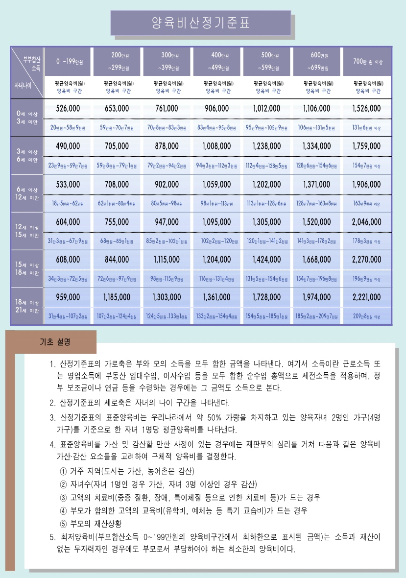 - 위의 양육비 산정기준표에서 자녀의 수, 나이, 부모 합산소득에 따른 표준 양육비 구간을 골라 산정하신 후