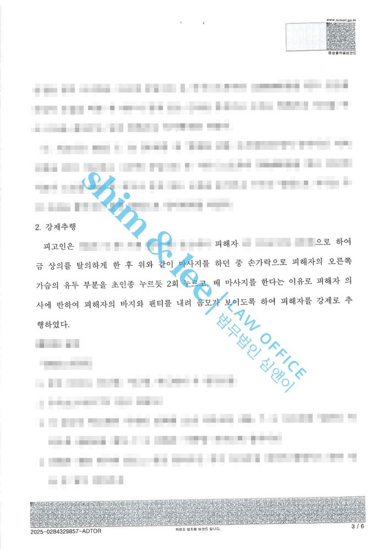 - 마사지가 끝날 무렵 가해자의 행동은 더욱 노골적으로 변했습니다. 의뢰인의 유두를 손가락으로 강하게 눌렀고, 허리 마사지를 하겠다며 의사의 동의 없이 바지를 내려 음모가 보일 정도로 신체를 노출시켰습니다. 또한, 허리 건강을 이유로 운동법을 알려주겠다며 의뢰인의 엉덩이 등 신체 부위를 조물거리듯 만지며 추행했습니다.