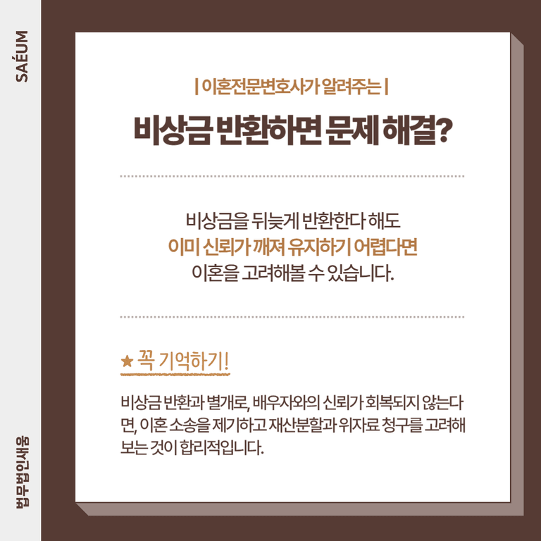 즉, 비상금 자체를 반환하는 것과 별개로, 배우자가 혼인 파탄의 원인을 제공했다는 점은 그대로 남아 있습니다. 따라서 신뢰가 회복되지 않는다면, 이혼 소송을 제기하고 재산분할 및 위자료 청구를 고려하는 것이 합리적입니다.