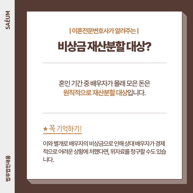 이와 별개로 배우자의 비상금으로 인해 상대 배우자가 경제적으로 어려운 상황에 처했다면, 위자료를 청구할 수도 있습니다.
