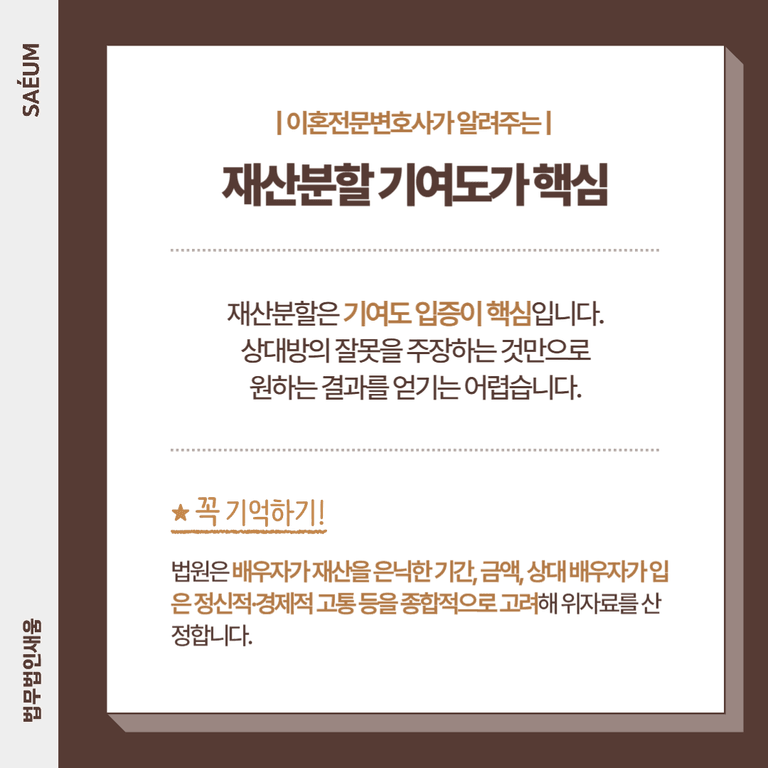 재산분할은 각 배우자의 기여도를 입증하는 과정입니다. 상대 배우자의 잘못을 주장하는 것만으로 원하는 결과를 얻기는 어렵습니다.