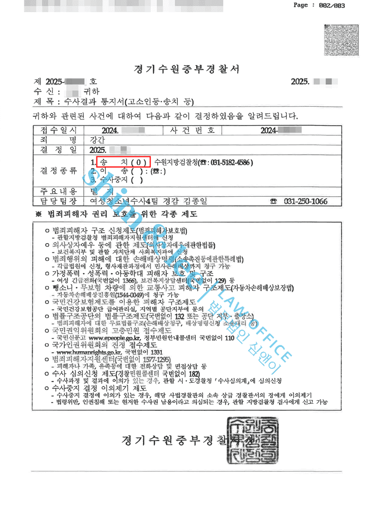- 경찰은 가해자에 대한 강간혐의를 인정하고, 검찰로 송치하였습니다.