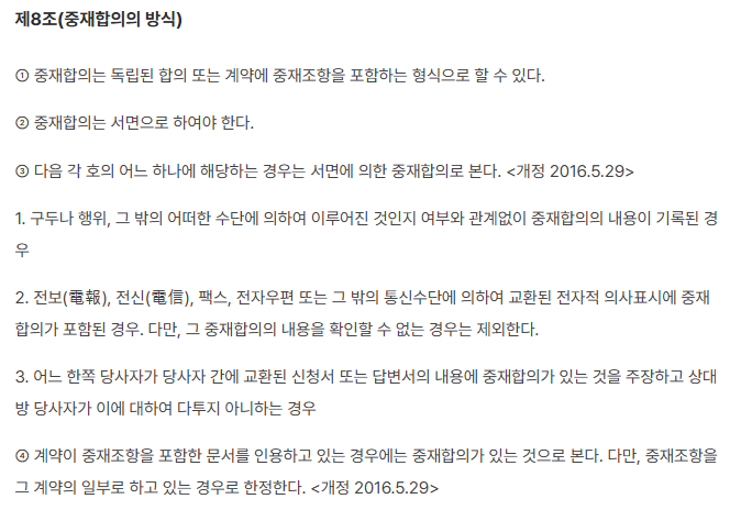맞습니다. 계약서 또는 구두라도 중재합의가 사전에 있어야 중재가 가능합니다. 한쪽만 원한다고 되는 것이 아닙니다. 물론 중재법에서는 중재합의를 엄격히 보지는 않습니다. 계약서 뿐만 아니라, 메일, 팩스 ,구두 등등 형식을 불문하고 근거가 남아있으면 중재합의로 간주합니다.