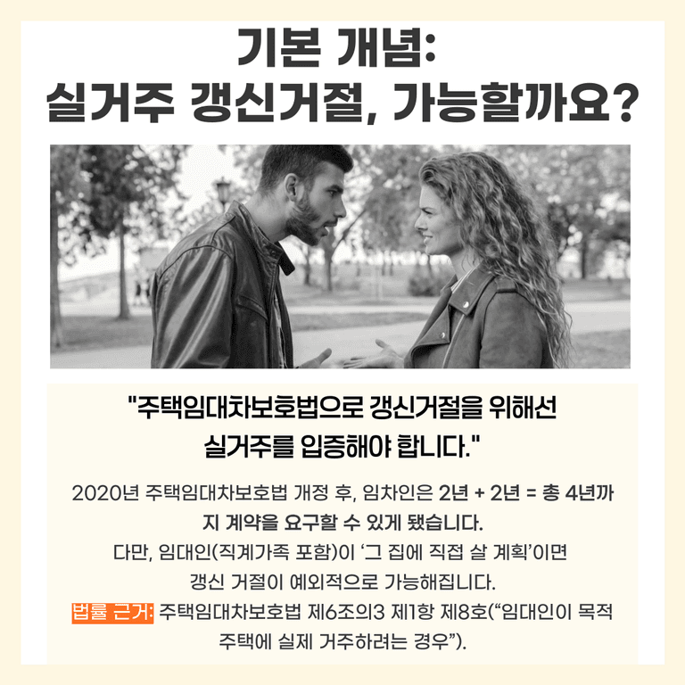 이번 글에서는 “실거주 갱신거절”이란 무엇이고, 집주인과 세입자는 각각 어떤 절차와 의무가 있는지 알아보겠습니다.