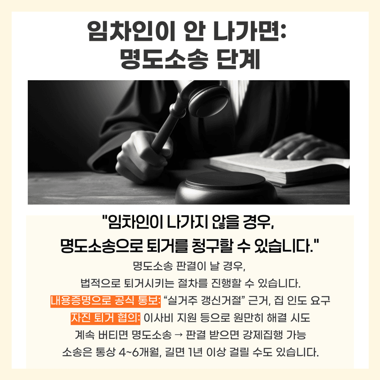 일부 집주인은 “이사비 조금 지원” 같은 방법으로 빨리 명도를 유도하기도 합니다. 법적 의무는 아니지만, 갈등을 줄이는 현실적 해결책이 될 수 있습니다.