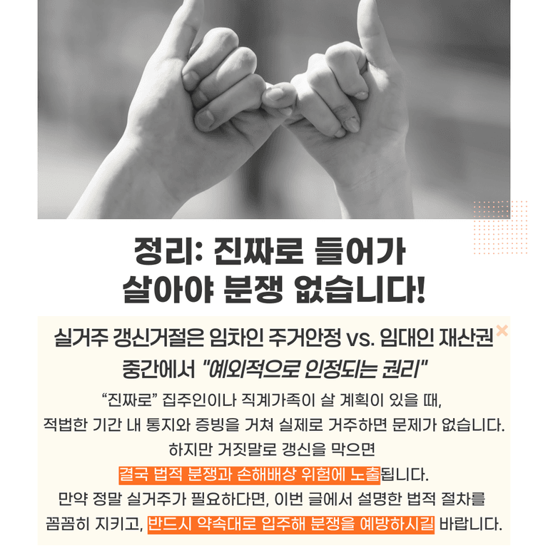 만약 정말 실거주가 필요하다면, 이번 글에서 설명한 법적 절차를 꼼꼼히 지키고, 반드시 약속대로 입주해 분쟁을 예방하시길 바랍니다.