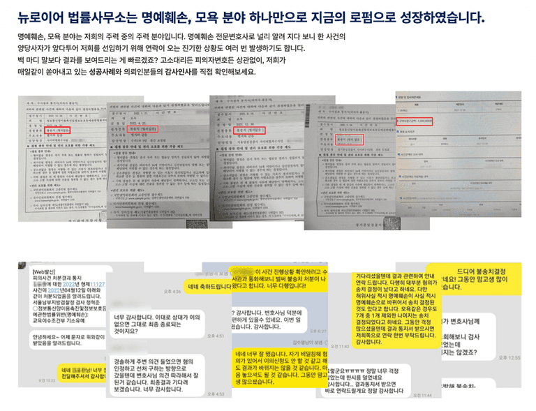 때문에 명예훼손은 저희가 가장 자신 있는 분야라 말씀드릴 수 있을 것 같습니다.