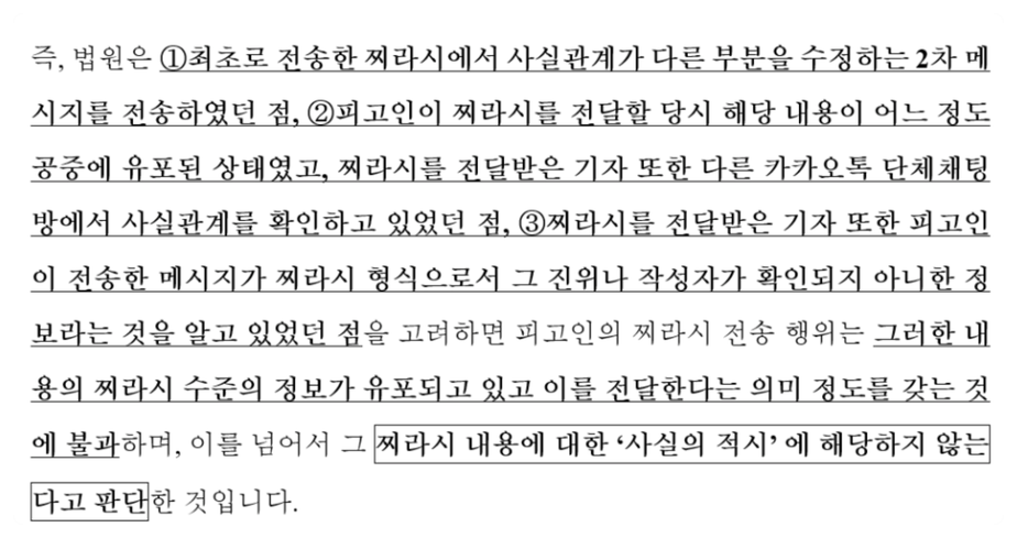 이때 하급심 판결례에 따라 찌라시는 사실 적시에 해당하지 않는다는 부분을 인용하여 무혐의를 이끌었습니다.