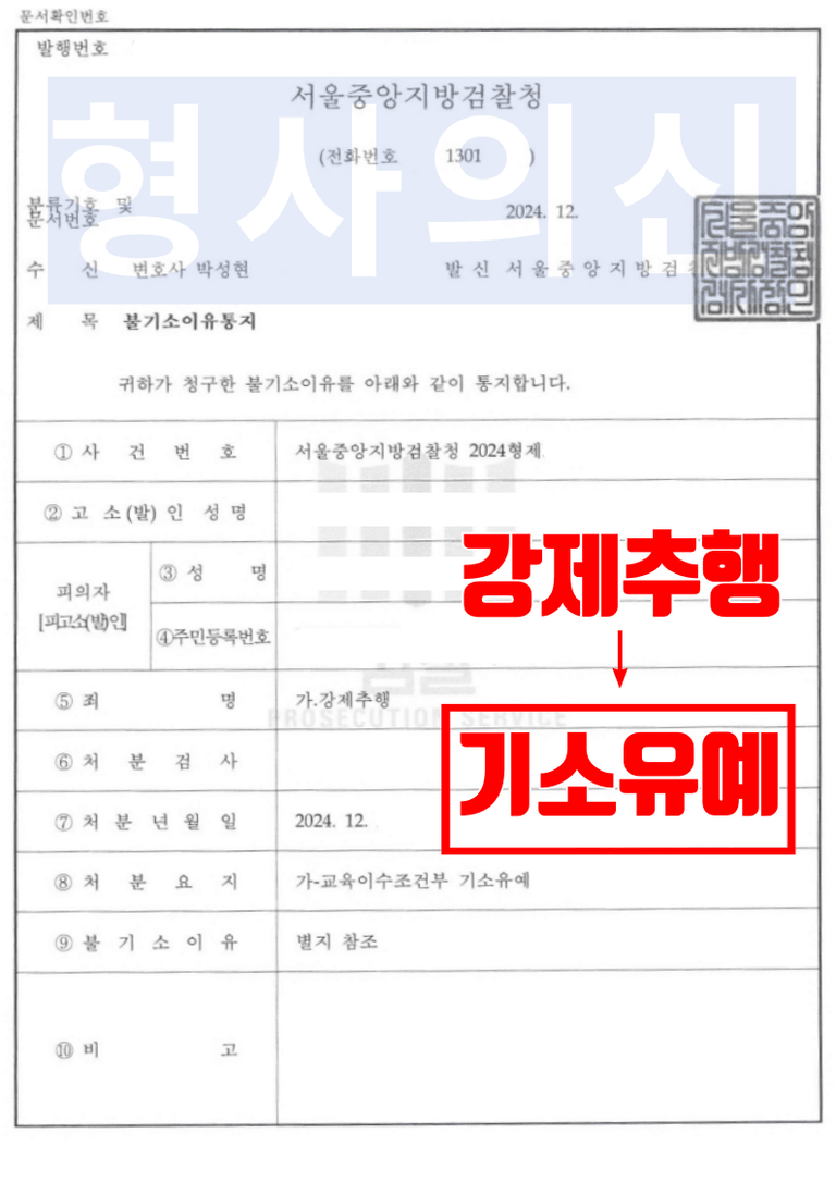 서울중앙지방검찰청 검사는 법률사무소 유(唯)의 형사전문변호사의 주장 및 제출한 양형사유를 받아들여, 범행 사실은 인정되나, 의뢰인이 형사처벌을 받은 전력이 없는 초범인 점, 피해자와 합의하여 피해자가 의뢰인에 대한 처벌을 원치 않고 있다는 점, 의뢰인이 잘못을 깊이 뉘우치면서 보호관찰소에서 실시하는 재범방지교육 프로그램을 성실히 이수하겠다고 다짐하고 있는 점 등을 이유로 ‘(교육이수조건부)기소유예’처분을 하였습니다.