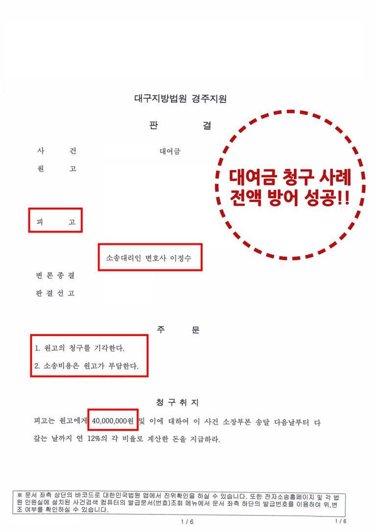 위와 같이 원고의 주장이 논리에 맞지 않고, 그 주장을 입증하지도 못한 점을 들어 대여금 청구 금액을 전액 방어할 수 있었습니다.