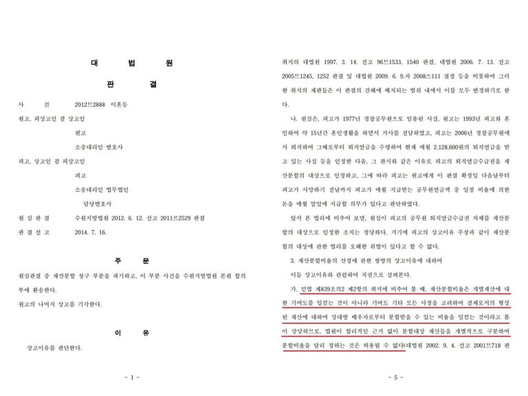 다만 민법 제839조의2 제2항의 취지에 비추어 볼 때, 재산분할비율은 개별재산에 대한 기여도를 일컫는 것이 아니라 기여도 기타 모든 사정을 고려하여 전체로서의 형성된 재산에 대하여 상대방 배우자로부터 분할받을 수 있는 비율을 일컫는 것이라고 봄이 상당하므로, 법원이 합리적인 근거 없이 분할대상 재산들을 개별적으로 구분하여 분할비율을 달리 정하는 것은 허용될 수 없다(대법원 2014. 7. 16. 선고 2012므2888 전원합의체 판결)는 것이 판례의 확고한 입장입니다.