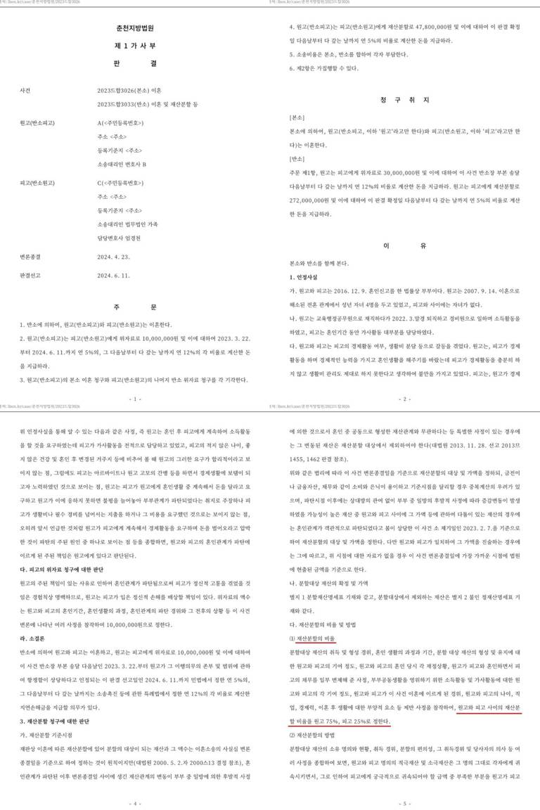 [원고와 피고의 적극재산 대부분을 당사자의 “일치”에 기초하여 적극재산을 특정하고 원고와 피고의 재산분할의 비율을 원고 75%, 피고 25%로 판단한 사례 : 춘천지방법원 2024. 6. 11. 선고 2023드합3026(본소), 2023드합3033(반소) 판결]