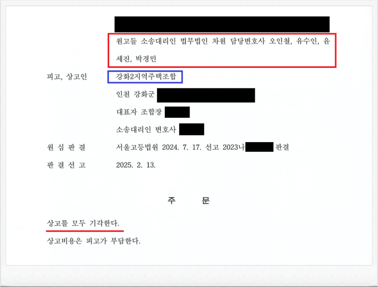 이번에도 재판부는 저의 주장을 받아들여, 피고 강화2지역주택조합 측의 상고를 기각하였고, 결국 지역주택조합 분담금 반환 소송 대법원 최종 승소 판결을 이끌어 내었습니다.