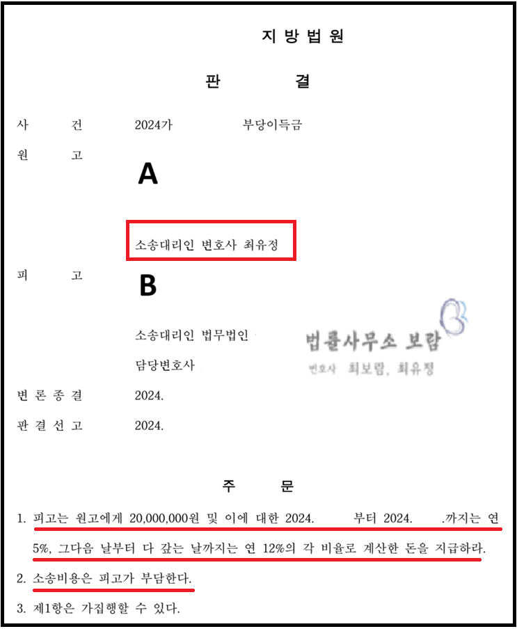 결국 법원은 양 당사자의 법률적 주장 및 사실관계를 면밀히 검토한 뒤, 최보람, 최유정 변호사의 주장을 받아들여 의뢰인 A와 B 사이에 가계약금을 해약금으로 하기로 하는 약정이 있었다고 볼 수 없다고 판단하여 B가 의뢰인 A에게 가계약금을 반환하라는 원고 전부 승소 판결을 하였습니다.