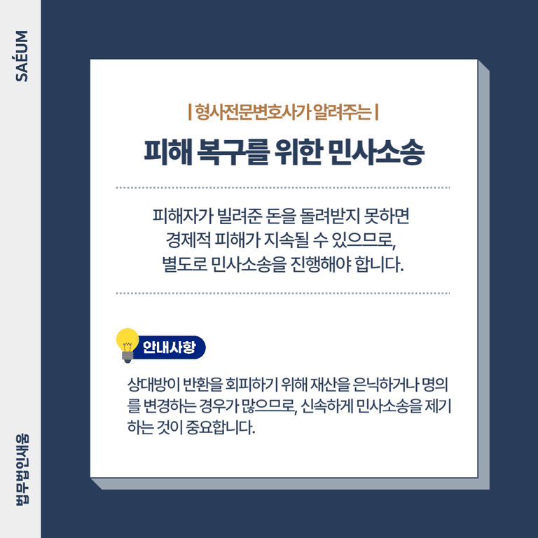 사기 고소를 통해 가해자가 형사 처벌을 받았다고 해서 피해 회복이 자동으로 이루어지는 것은 아닙니다. 피해자가 빌려준 돈을 돌려받지 못하면 경제적 피해가 지속될 수 있으므로, 형사 절차와 별도로 민사소송을 함께 진행해야 합니다.