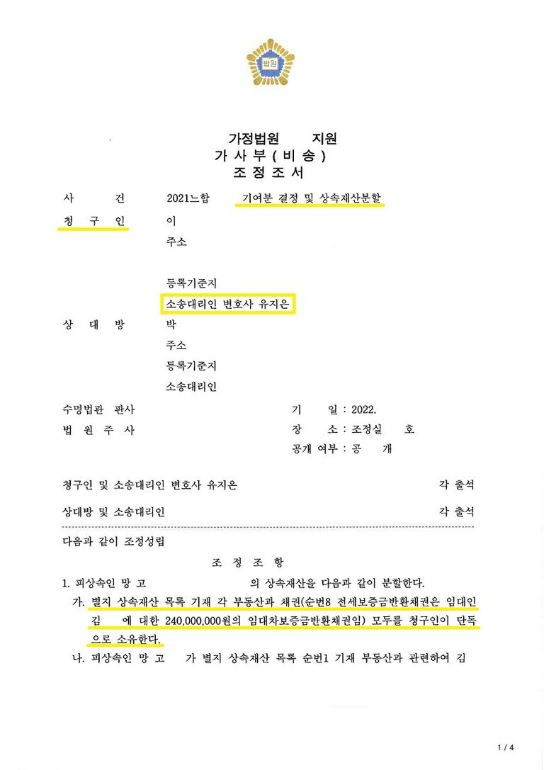 결국 자녀임에도 기여분을 70% 가까이 인정받을 수 있었으며, 부동산의 경우 상속인들이 공유하는 형태인 현물분할이 원칙이지만 남아있는 모든 상속재산을 의뢰인이 단독으로 분할 받으며 누나에게는 최소한의 금액만 지급하는 내용으로 성공적으로 조정이 성립한 사안입니다.