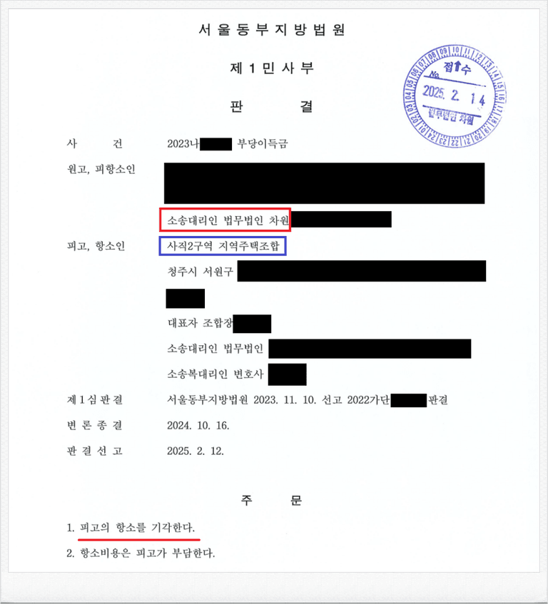 저는 지역주택조합 가입계약의 취소(해제)에 따른 금원의 부당이득 반환 청구 소송을 상당수 진행한 노하우가 있으며, 의뢰인의 이익을 위해 '승소'의 결론을 이끌어내고 있습니다.