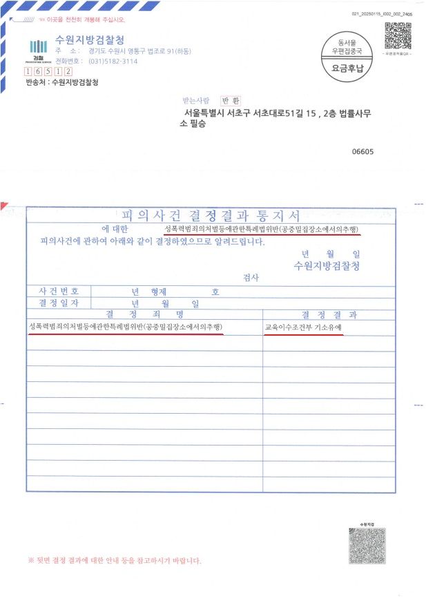 ※ 이에 수원지방검찰청은 "기소유예" 처분을 하여 의뢰인님께서는 아무런 전과기록도 남지 않은 사건입니다.