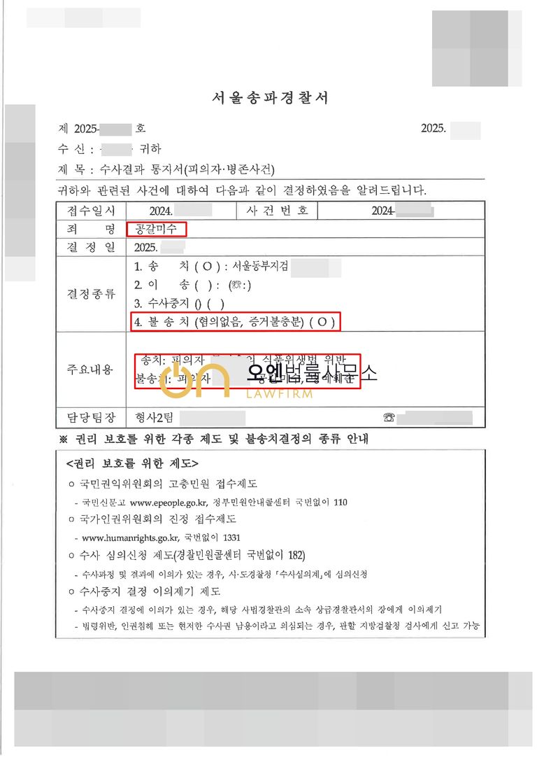 담당 수사관은 본 변호인의 의견을 받아들여 공갈미수 혐의에 대해 혐의없음 결정을 내렸습니다.