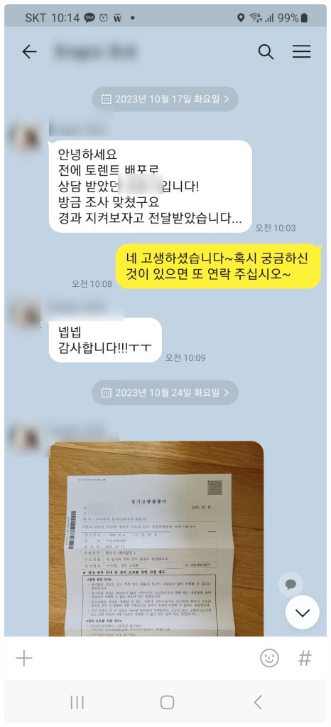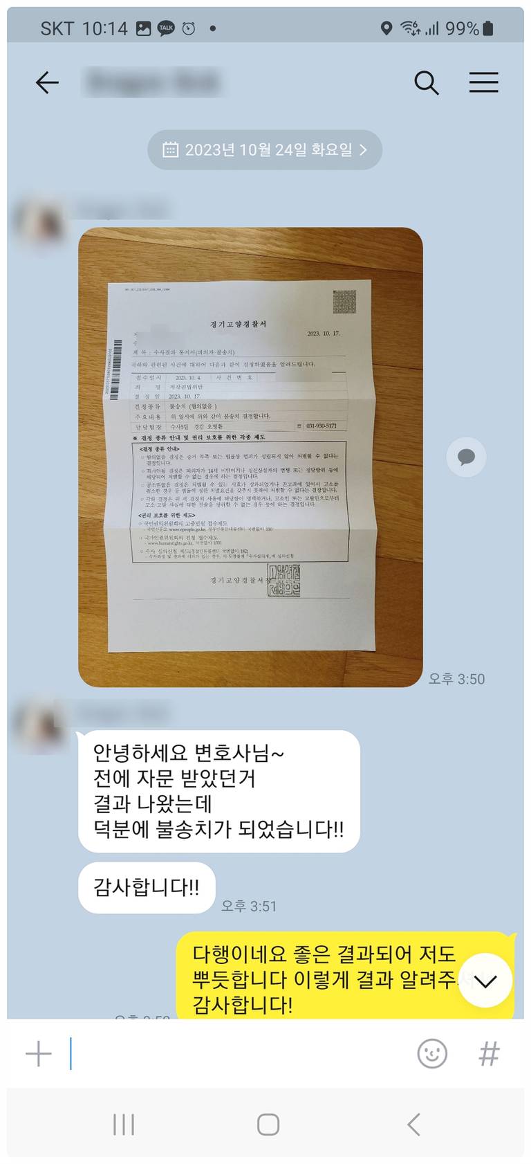 < 저 작 권 법 위반 무혐의 종결한 의뢰인분의 카톡 >