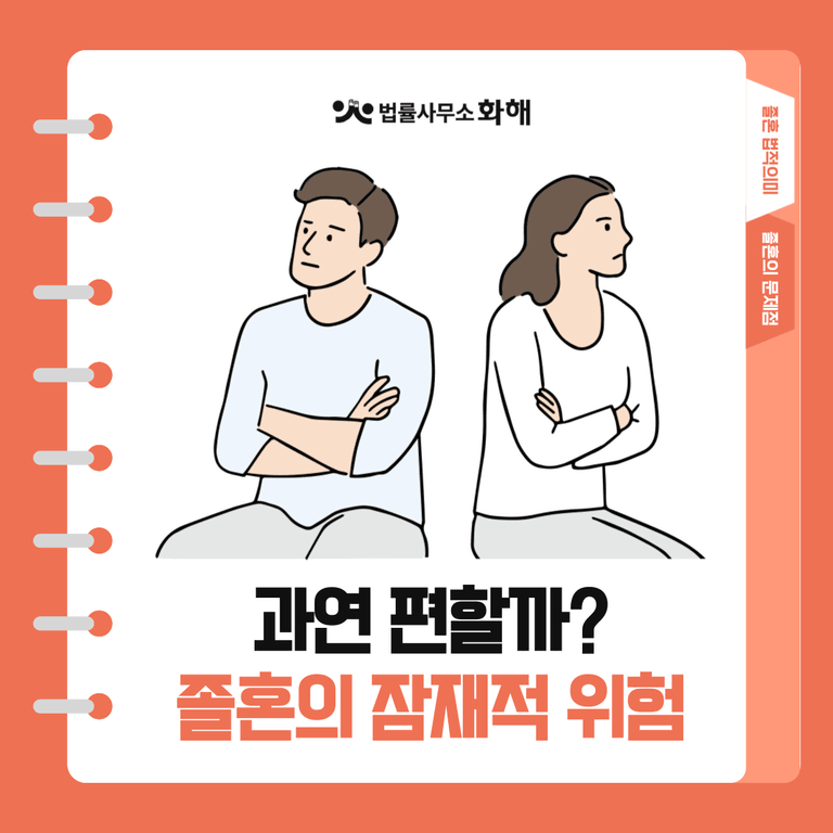 그러므로 부부가 서로 합의 하에 졸혼을 선택할 경우에는 재산 분배와 생활비 지급, 사생활 보장 범위 등에 대한 구체적인 합의가 필요합니다. 이를 위해 저희 법률사무소 화해와 같은 이혼·가사 전문 변호사를 통한 ‘졸혼 합의서’ 작성을 추천드리며, 이는 향후 발생할 수 있는 분쟁을 예방하는 데 도움됩니다.