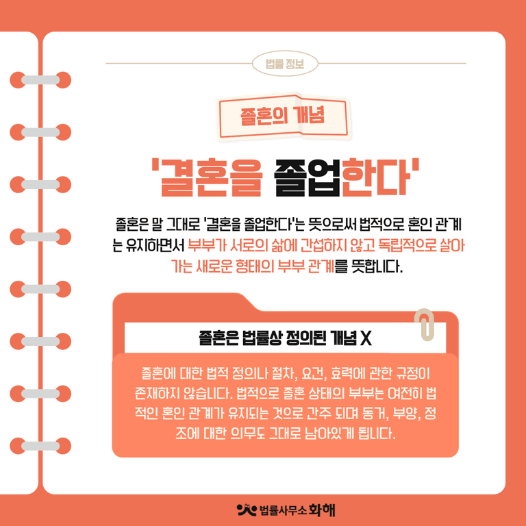 또한 졸혼은 법률상 정의된 개념이 아닙니다. 따라서 졸혼에 대한 정확한 법적 정의나 절차, 요건, 효력에 관한 규정이 존재하지 않습니다. 법적으로 졸혼 상태의 부부는 여전히 법적인 혼인 관계가 유지되는 것으로 간주 되며 동거, 부양, 정조에 대한 의무도 그대로 남아있게 됩니다.