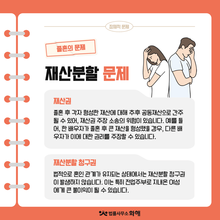 먼저 졸혼 후 각자 형성한 재산에 대해 추후 공동재산으로 간주될 수 있어, 재산권 주장 소송의 위험이 있습니다. 예를 들어, 한 배우자가 졸혼 후 큰 재산을 형성했을 경우 다른 배우자가 이에 대한 권리를 주장할 수 있습니다.