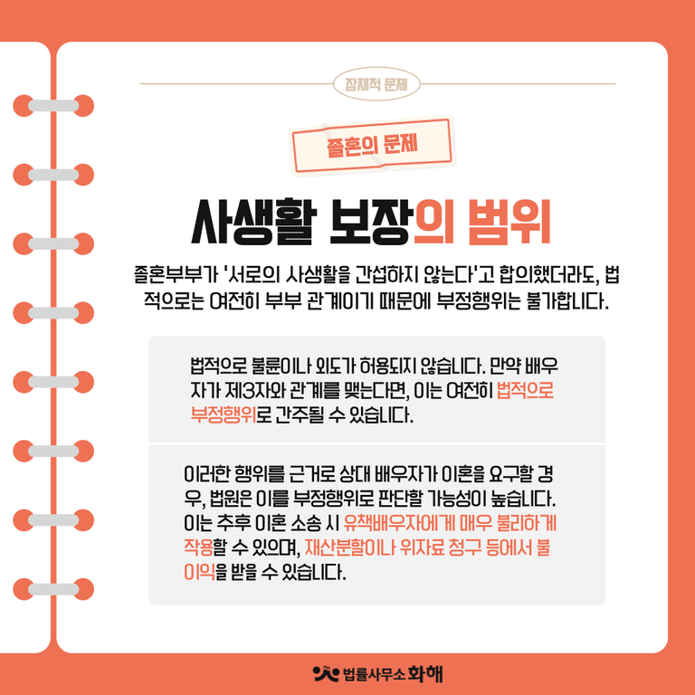 졸혼한 부부가 '서로의 사생활을 간섭하지 않는다'고 합의했다 하더라도, 법적으로는 여전히 부부 관계이기 때문에 여러 문제가 발생할 수 있습니다.