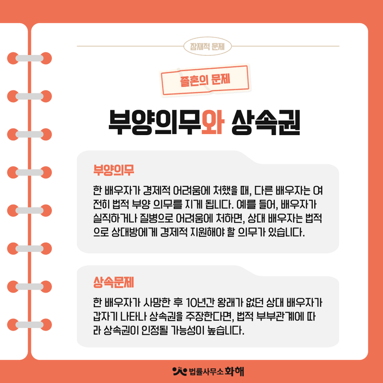 마지막으로 법적으로 혼인 관계가 유지되는 졸혼의 특성상, 부양 의무와 상속권 등의 문제가 매우 복잡해질 수 있습니다.