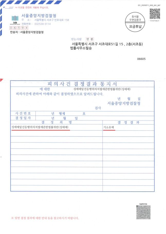 의뢰인님께서는 최근 성매매 처벌 수위에 비추어 벌금형이 선고될 위험이 높은 상황이었습니다. 그러나 앞서 말씀드린 다양한 방법으로 경찰, 검찰 수사 단계를 신중히 진행하였고 이에 서울중앙지방검찰청은 의뢰인님에게 "기소유예"처분을 내렸습니다.