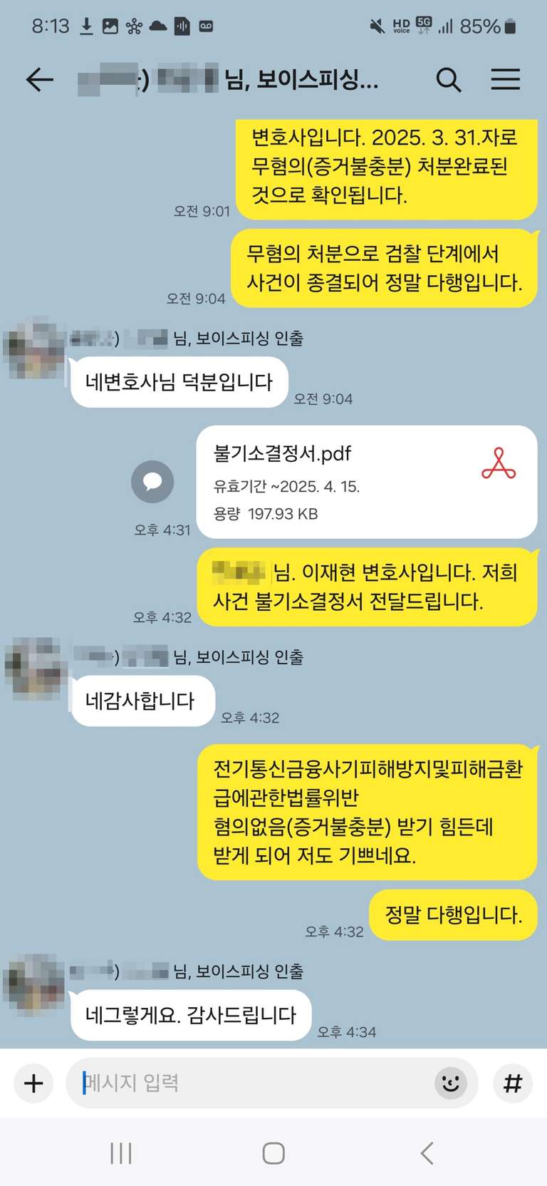 보이스피싱 정범의 범행을 돕는다는 '미필적 고의'가 없었다고 인정받기 위해서는, 법률 전문가인 변호사로부터 사건의 사실관계, 보이스피싱 정범과 주고받은 대화 내용 등 일체의 증거들을 검토 받은 후에, 경찰 조사 전 필수적으로 묻게 되는 질의 내용에 대해 미리 답변을 준비하셔야 합니다.