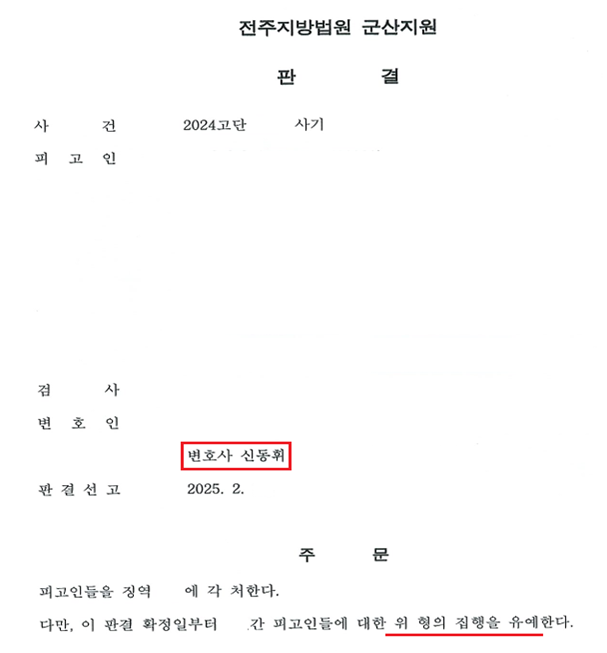 본 변호인의 조력 결과 법원은 피고인에게 징역형의 집행유예를 선고하였습니다.