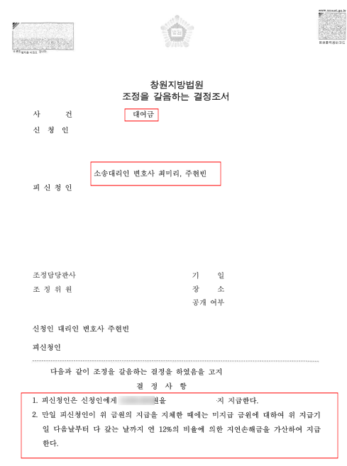 법원은 신청인의 주장과 제출된 증거들을 검토한 결과, 대여금 채권의 존재를 인정하고 미지급 원금에 더해 연 12%의 지연손해금을 가산하여 지급하라는 조정갈음결정을 내렸습니다. 이는 의뢰인의 정당한 권리를 법적으로 인정받은 것으로, 강제집행 등 후속 절차를 통해 채권을 회수할 수 있는 법적 근거를 확보한 것입니다.