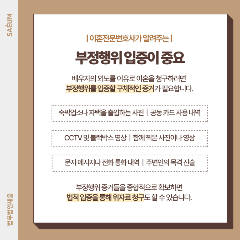 이와 같은 증거들을 종합적으로 확보하면 부정행위를 법적으로 입증할 수 있으며, 이를 바탕으로 위자료 청구도 가능합니다.