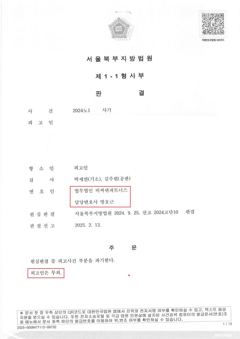 방변은 의뢰인의 실수로 피해를 입은 피해자가 존재하고 이에 대한 피해회복은 하는 것이 합당하고 무죄 판결을 받는데도 도움이 될 것라고 말씀드려 무죄를 다투지만 피해금의 일부를 지급하고 피해자와의 합의를 하였습니다.