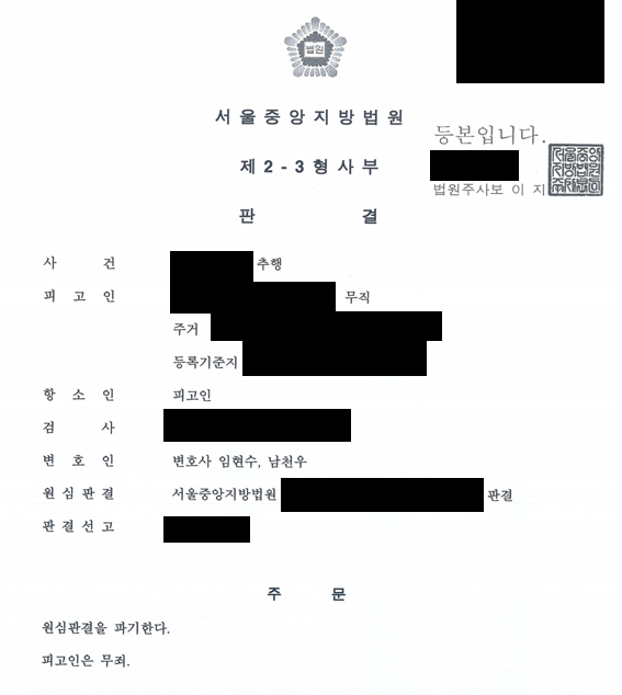 본 사건은 1심에서 유죄 판결이 선고되고 피해자 및 증인들의 진술로 피고인에게 매우 불리한 상황이었습니다. 이런 상황에서 항소심 단계에서 새로 선임된 변호인이 재차 증인신문까지 실시하여 무죄 판결을 받아내기란 결코 쉽지 않은 일입니다. 실제로 1심에서의 유죄 판결은 항소심에서 번복되기 매우 어려운 것이 현실입니다. 1심 재판부가 설시한 유죄 심증 형성의 근거를 정면으로 반박하기 위해서는 치밀한 공소사실 분석과 모순된 증언에 대한 탄핵, 새로운 증거 제출 및 정황 입증 등 변호인의 총력전이 필요하기 때문입니다. 그럼에도 불구하고 본 사건 변호인은 핵심 쟁점을 정확히 짚어내고 변호인의 치밀한 법리 검토와 모순된 진술 분석, 정황증거 제시 등을 통해 피해자 등 증인 진술의 신빙성을 효과적으로 탄핵함으로써 피고인의 억울함을 밝혀 항소심 재판부를 설득하는 데 성공하였습니다.