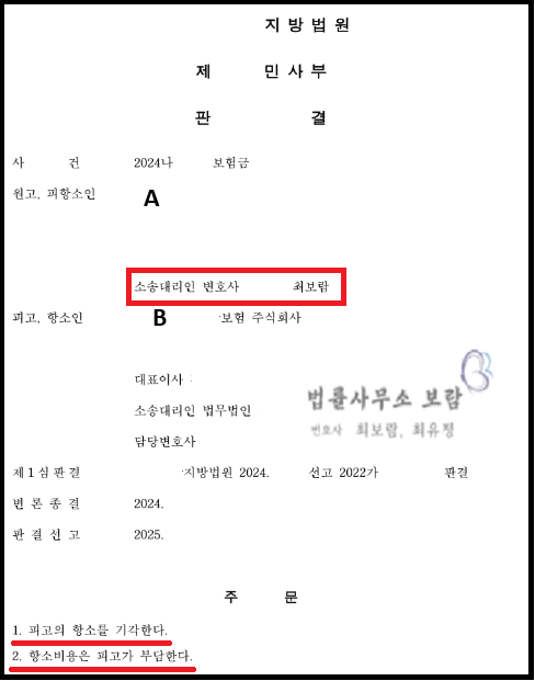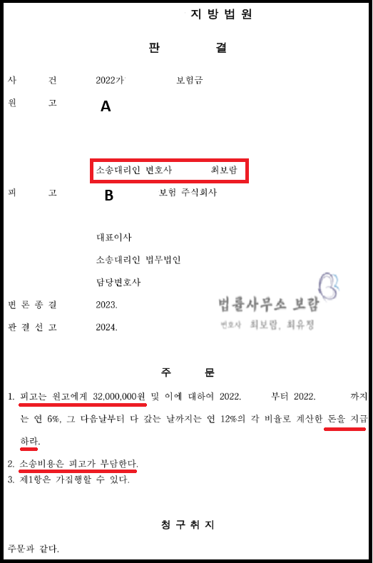 결국 법원은 최보람, 최유정 변호사가 제출한 소장, 준비서면, 증거 등을 면밀히 검토한 뒤, 최보람, 최유정 변호사의 주장을 받아들여 보험사 B가 의뢰인 A에게 보험금을 지급하여야 한다고 판단했습니다.