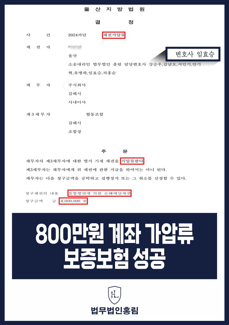 그 결과 법원에서는 본 변호인의 주장을 받아들여 통장 가압류(전액 보증보험)하였습니다.