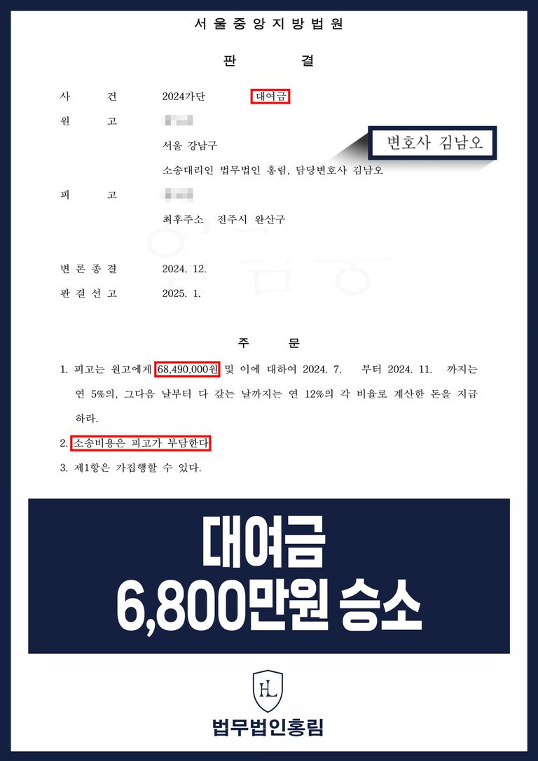 재판부는 변호인의 주장을 받아들여 '피고는 원고에게 대여금 6,800만원 전액과 소송비용은 전액 부담한다.'라는 판결을 내렸습니다