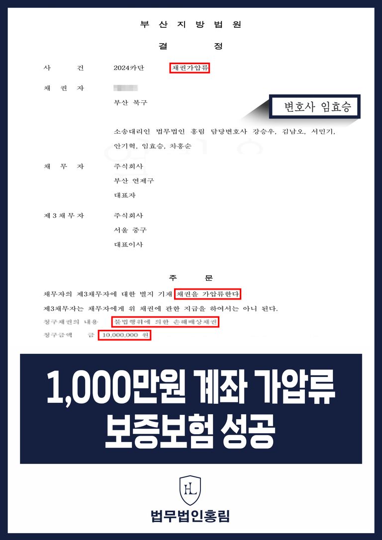 그 결과 법원에서는 본 변호인의 주장을 받아들여 통장 가압류(전액 보증보험)하였습니다.