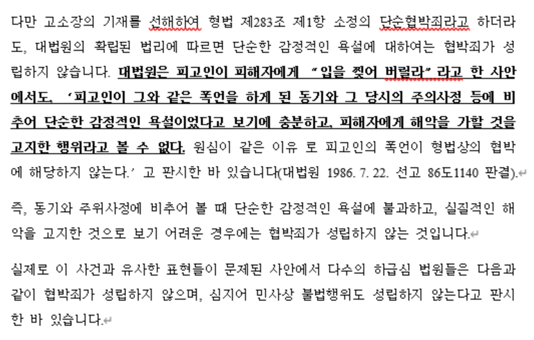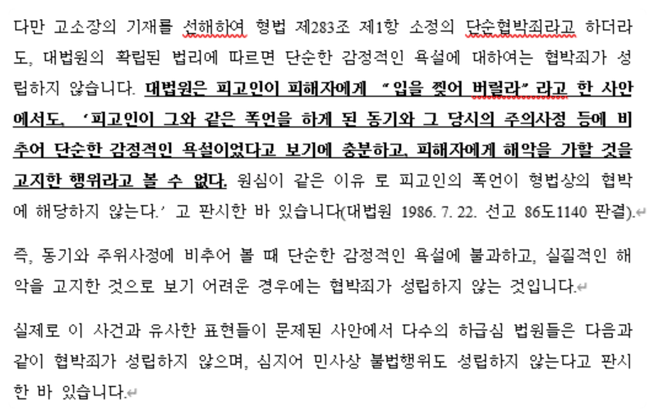 저희 또한 해당 판례를 근거로 협 박 죄 무혐의를 이끈 경험이 있어 자신 있게 말씀드릴 수 있습니다.