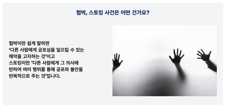 ![[협박/스토킹] 협박죄 반의사불벌죄? 무혐의 방어 요소 공개](/_next/image?url=https%3A%2F%2Fd2ai3ajp99ywjy.cloudfront.net%2Fuploads%2Ftitleimage%2Foriginal%2F5c11cf08b32f87c239f1da45-original.jpg&w=3840&q=75)