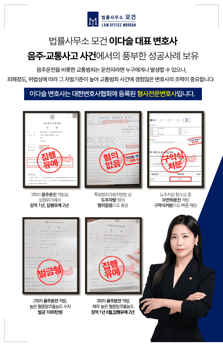 법률사무소 모건의 이다슬 대표 변호사는 음주운전, 뺑소니, 교통사고 등 다양한 교통범죄를 전문적으로 수행해왔습니다. 상담예약 시 변호사가 직접 상담하며 상황에 맞는 법률도움을 드리고 있으니, 자세한 상담이 필요하신 분들께서는 상담창구로 문의하여주시기 바랍니다.
