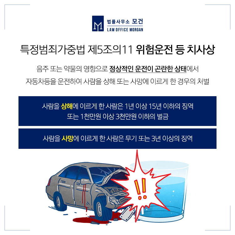 한편 초범이든 재범이든 음주운전 중 교통사고를 일으켰다면 운전자의 업무상과실에 따른 치사상죄가 추가되기 때문에 처벌수위는 더욱 상향됩니다. 다행히 인명피해없이 물피사고라면 다행이지만, 사상자가 발생하였다면 그에 상응한 처벌을 피하기 어렵습니다.
