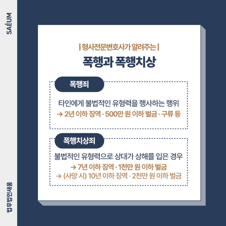 폭행죄란 타인에게 불법적인 유형력을 행사하는 행위를 의미합니다. 단순히 신체를 가격하는 것뿐만 아니라, 상대방의 얼굴에 담배 연기를 내뿜거나 머리카락을 자르는 등의 행위도 폭행죄에 해당할 수 있습니다. 이 경우 2년 이하의 징역 또는 500만 원 이하의 벌금, 구류 등의 처벌을 받을 수 있습니다. 만약 상대방이 상해를 입었다면 폭행치상죄로 7년 이하의 징역 또는 10년 이하의 자격정지, 1천만 원 이하의 벌금에 처해질 수 있으며, 폭행으로 인해 사람이 사망했다면 3년 이상의 징역형이 선고될 수 있습니다.