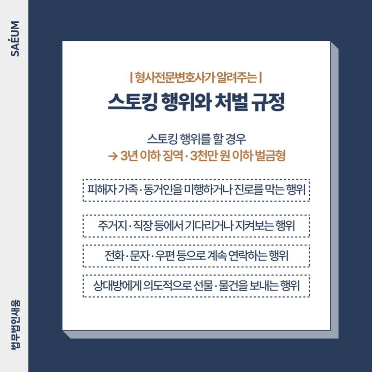 등이 이에 해당합니다. 이러한 스토킹 행위를 할 경우 3년 이하의 징역 또는 3천만 원 이하의 벌금에 처해질 수 있습니다. 만약 위험한 물건을 이용해 범행을 저질렀다면 5년 이하의 징역 또는 5천만 원 이하의 벌금에 처해질 수 있으므로 각별한 주의가 필요합니다.