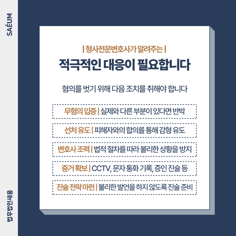 만약 이러한 상황에 놓였다면 즉시 변호사와 상담하여 적극적으로 대응하는 것이 필수적입니다. 초기에 적절한 법적 조치를 취하지 않으면 억울한 처벌을 받을 수 있으므로, 빠른 대응을 통해 자신의 권리를 보호하는 것이 중요합니다. 특히, 객관적인 증거 확보와 법률 전문가의 조언을 적극 활용하는 것이 억울한 혐의를 벗어나는 핵심 전략이 될 수 있습니다.