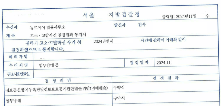 이에 저희 뉴로이어 법률사무소는 허위소문을 퍼뜨린 상대방을 업무방해와 명예훼손으로 고소하였고, 검찰의 기소처분을 이끌어냈습니다.